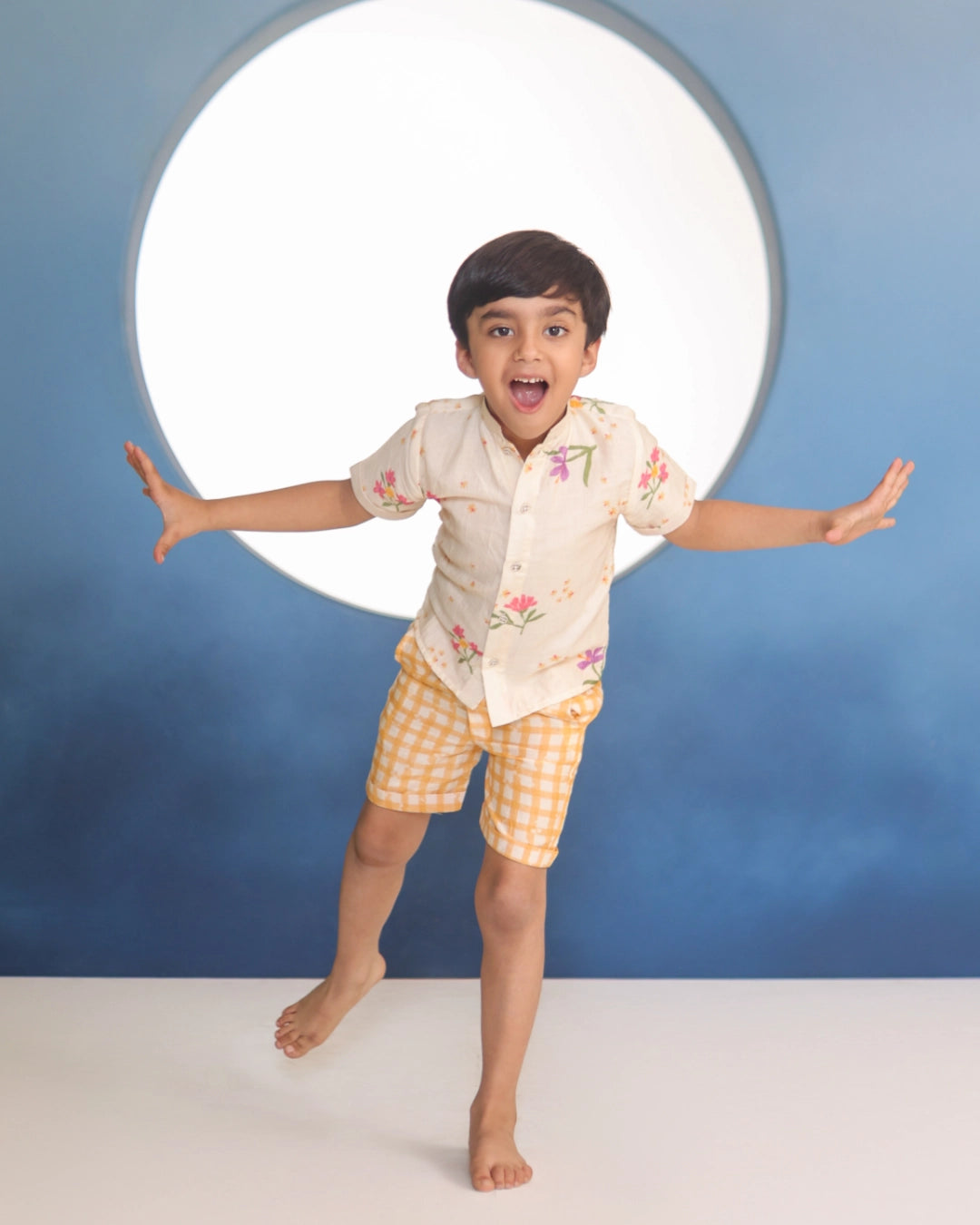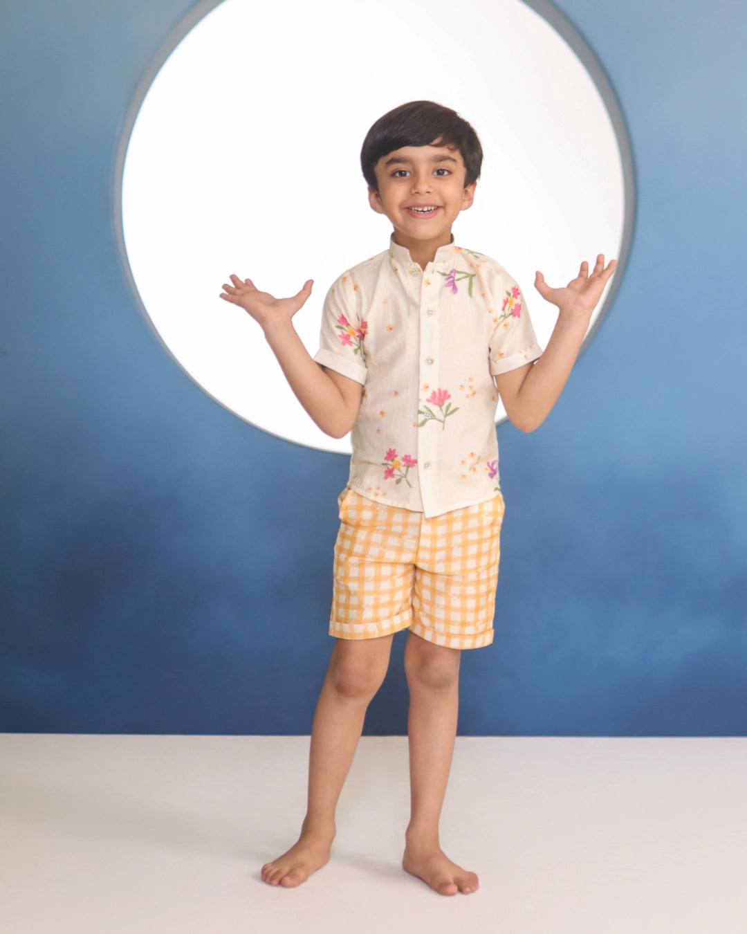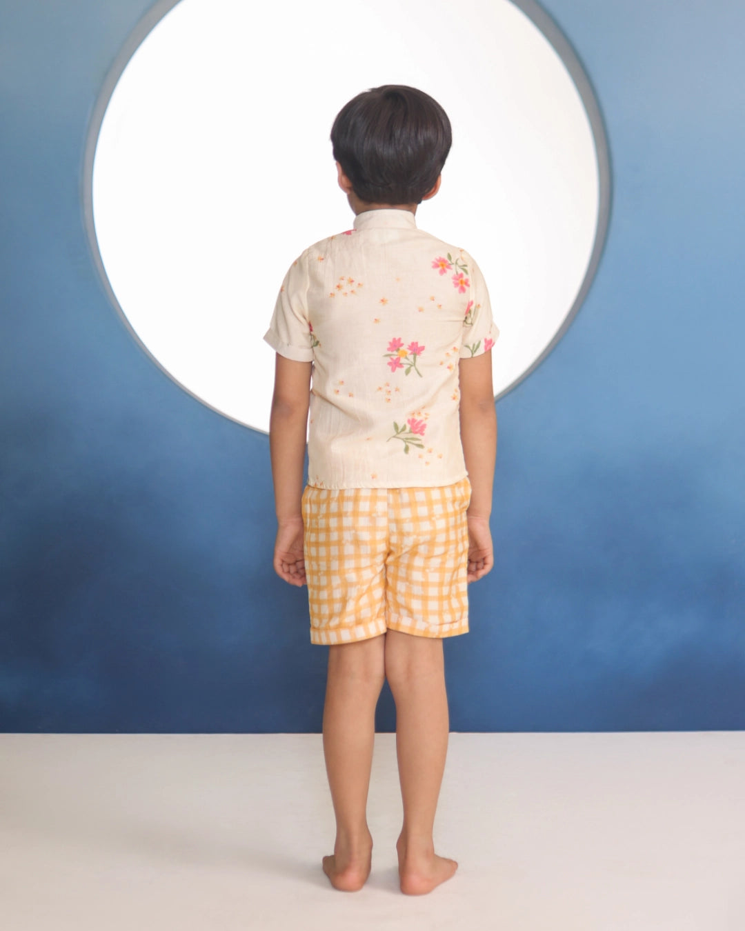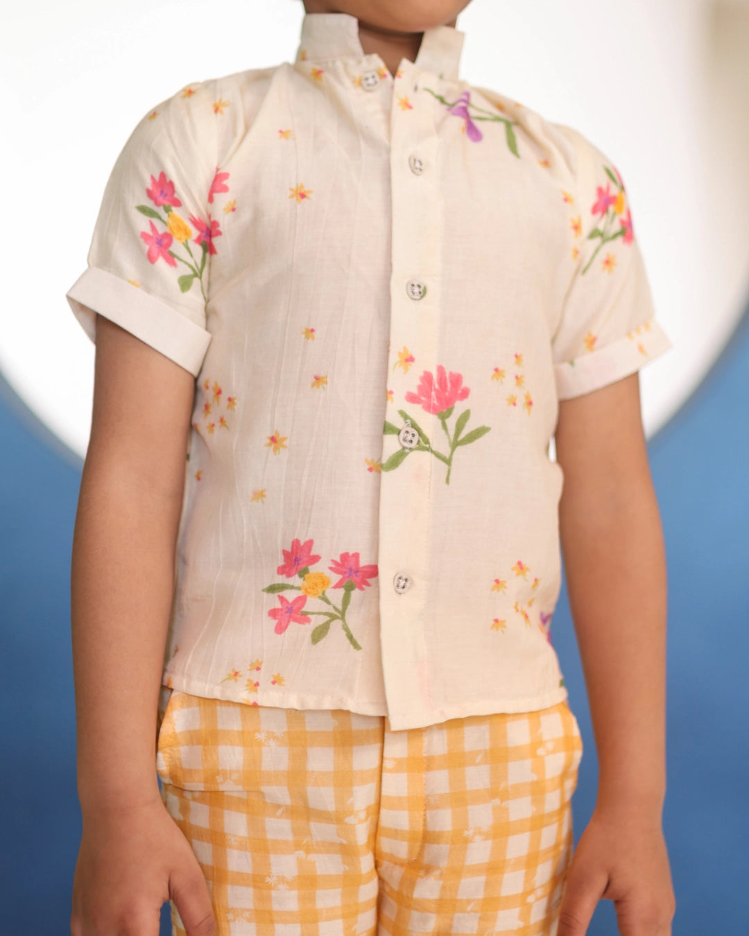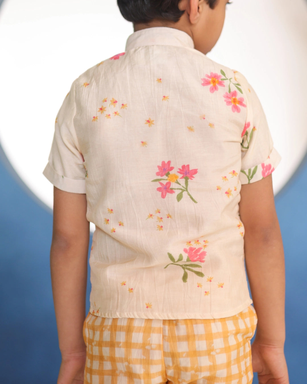 Ahaan means dawn — a beginning, a brightness. A Malai Chanderi coord with delicate floral prints, a clean mandarin collar shirt, and matching shorts. The florals are light and cheerful without being loud. Made for the boy who shows up to every occasion looking like he means it.